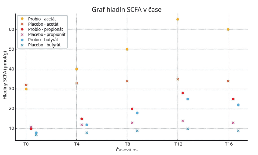 Od 8. týždňa došlo v probiotickej skupine k výraznému zlepšeniu symptómov oproti placebu, pričom rozdiely boli štatisticky významné. Po 12 týždňoch sa signifikantne zvýšili hladiny SCFA, najmä butyrátu (graf), ktorý sa ukázal ako najviac spojený s úľavou od symptómov (R = 0,43, p = 0,002). Zlepšila sa črevná priepustnosť (pokles L/M pomeru) a stúpli koncentrácie okludínu, klaudínu-1 a zonulínu, čo svedčí o obnove bariérovej funkcie čreva. Zápalové markery ako CRP, IL-6, TNF-α a kalprotektín sa výrazne znížili, čo naznačuje moduláciu imunitnej odpovede. Analýza podskupín potvrdila účinnosť intervencie naprieč všetkými podtypmi IBS.